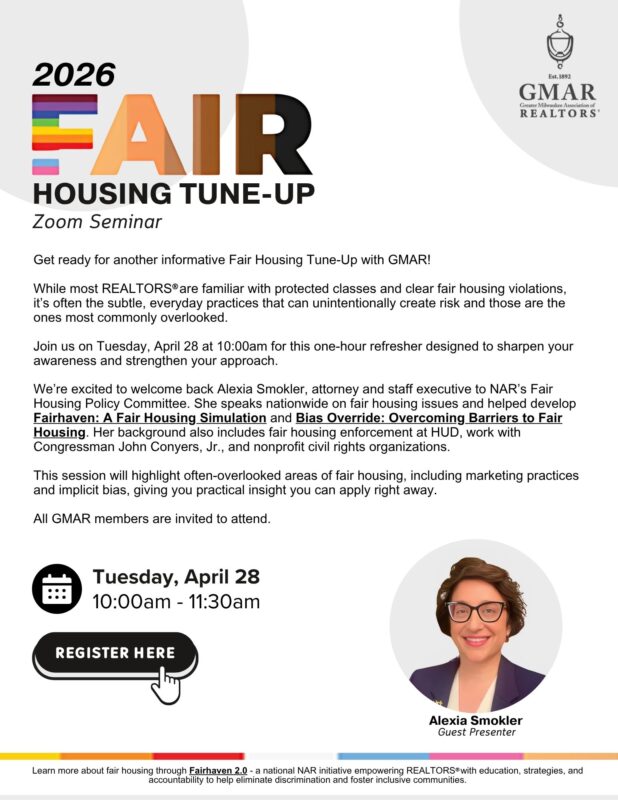 Join GMAR on Tuesday, April 28 at 10:00am for a one-hour Fair Housing Tune-Up designed to refresh your knowledge and highlight the everyday practices that can unintentionally create risk.
