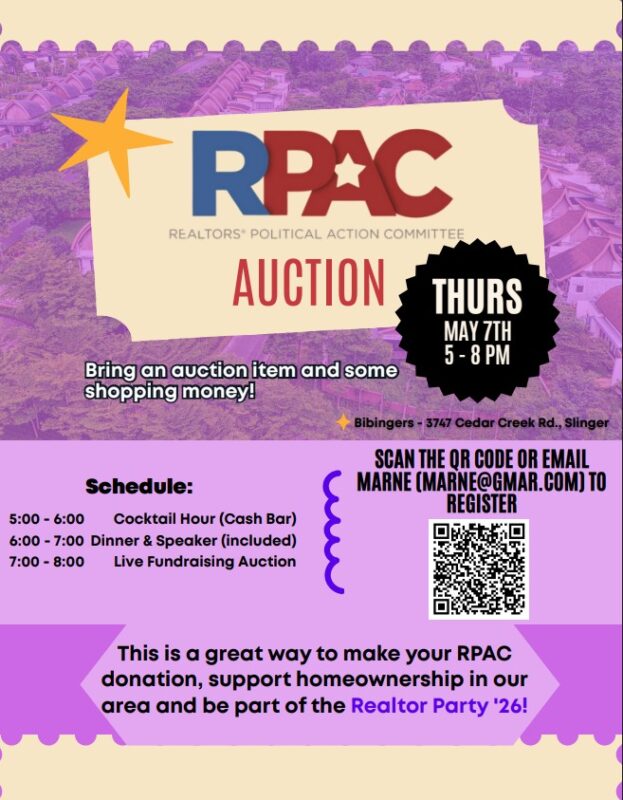 The RPAC Auction will be held on Thursday, May 7, 2026. Please bring an auction item and join in the fun! This is a live auction and a great way to make your 2026 RPAC or Direct Giver contribution and get something to take home with you.